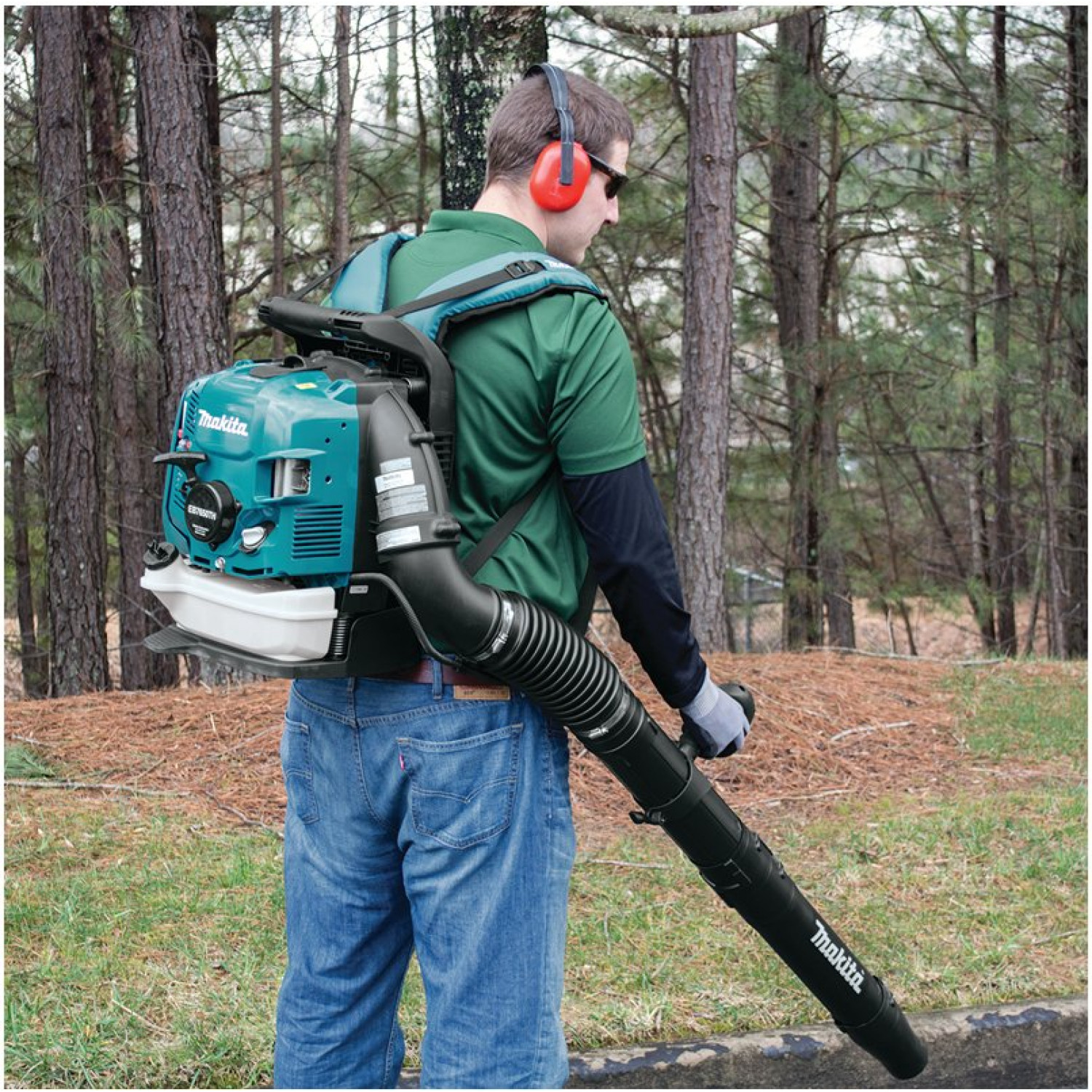 - Используется бензовоздуходувка Makita EB7650TH для выполнения сложных работ по уборке.